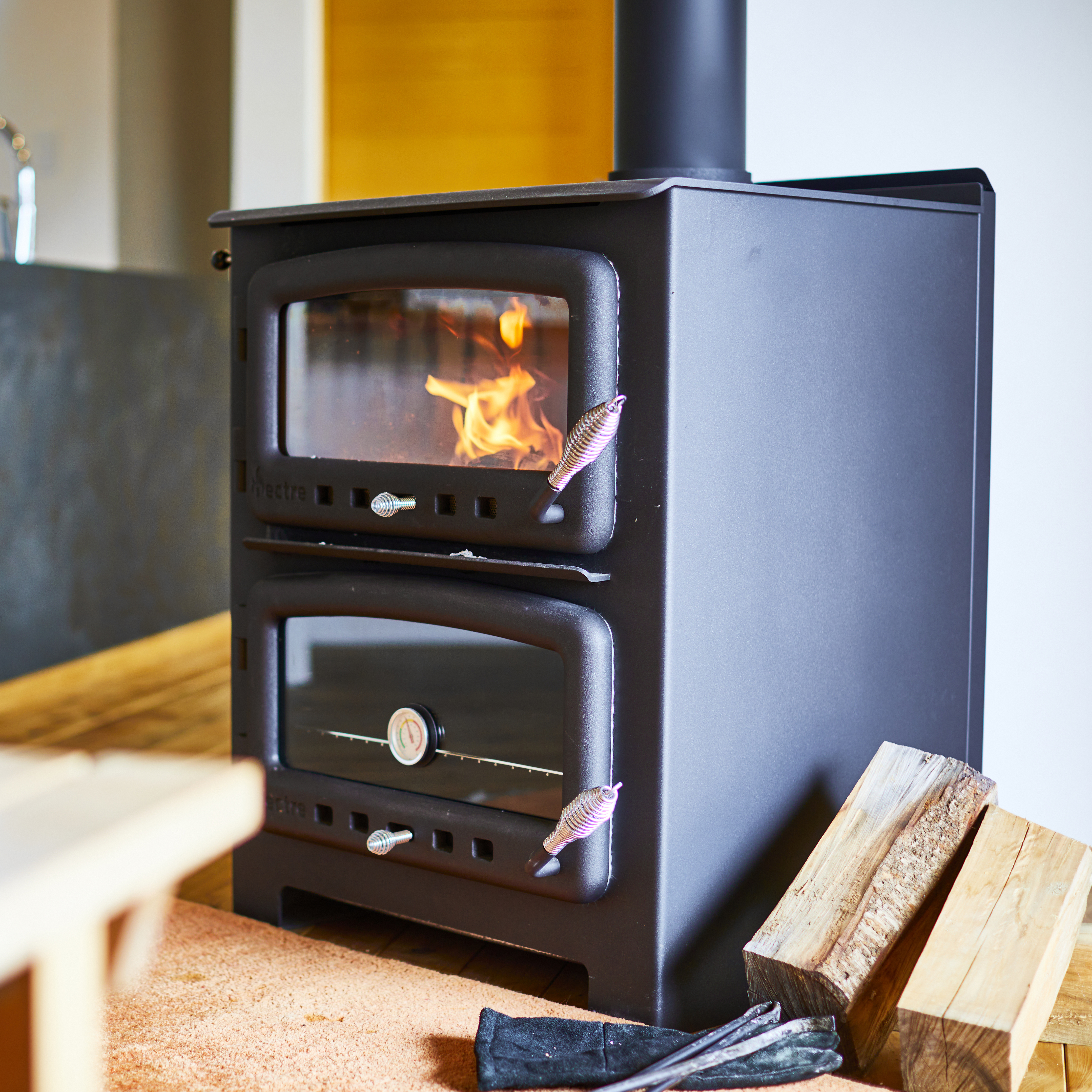 ネクター製の大型薪ストーブは炎を楽しみながら、自家製ピザも味わえます