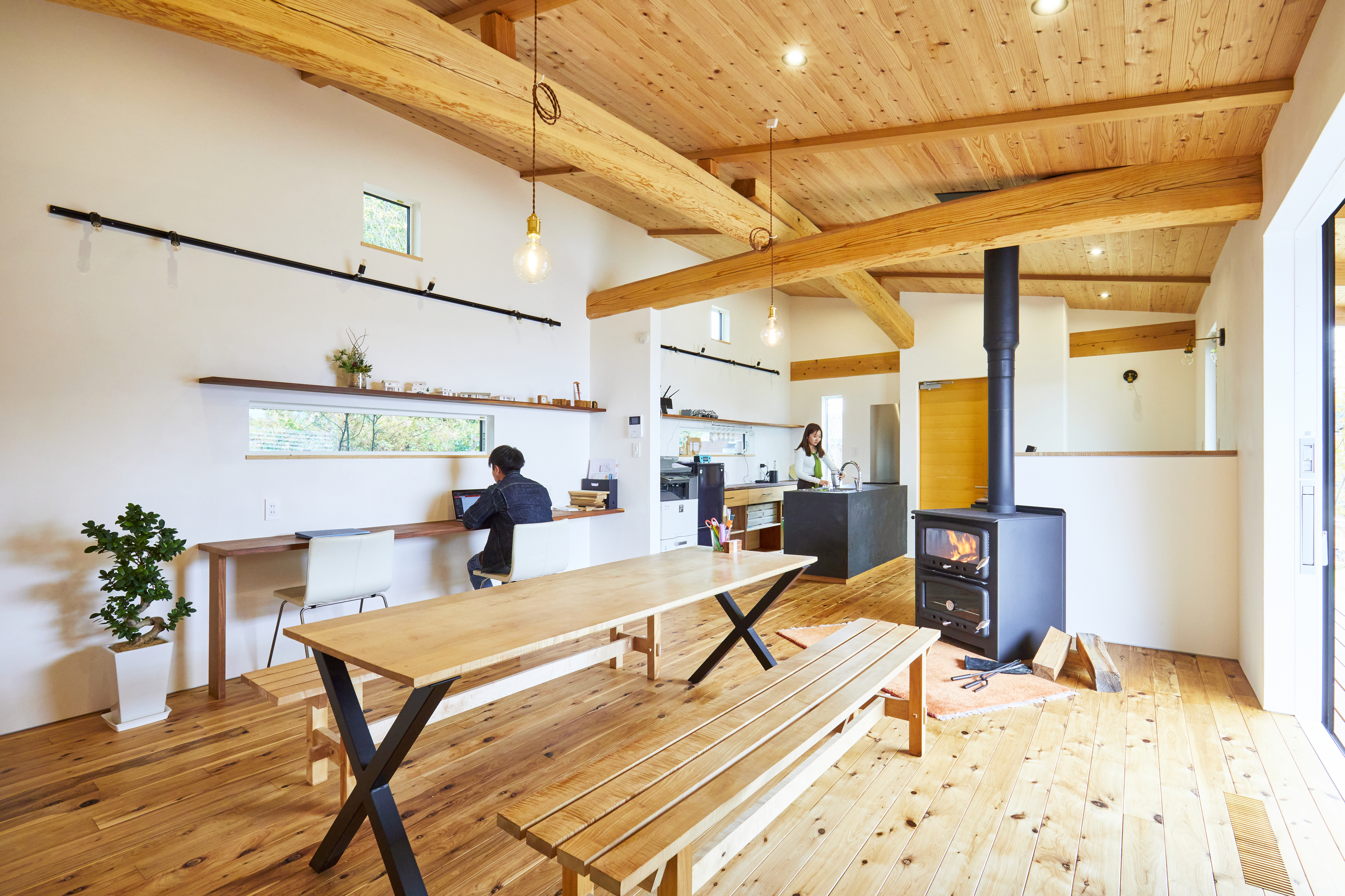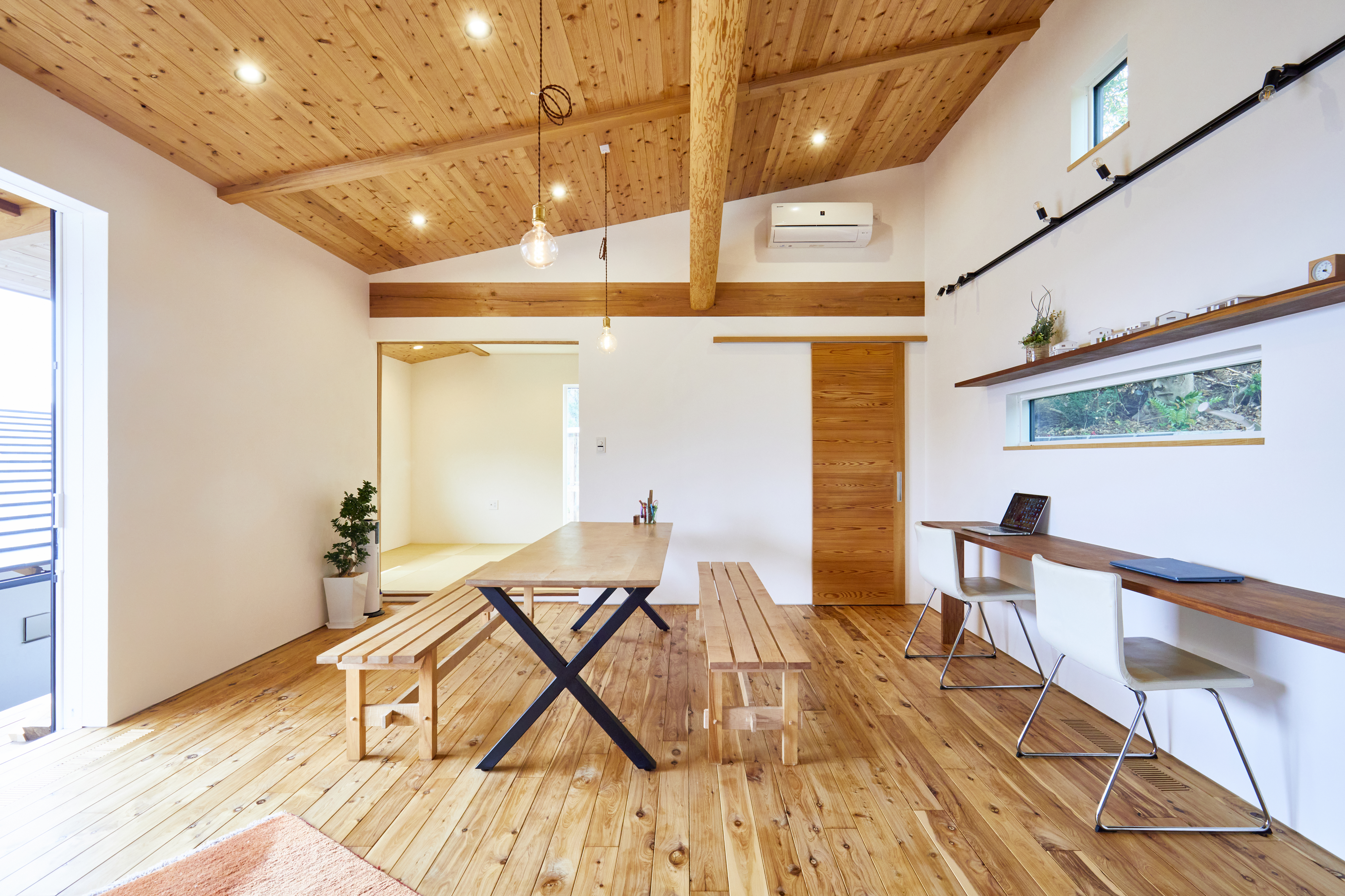 無垢の木の床と天井、そして呼吸する壁が湿度を快適に調えます。
